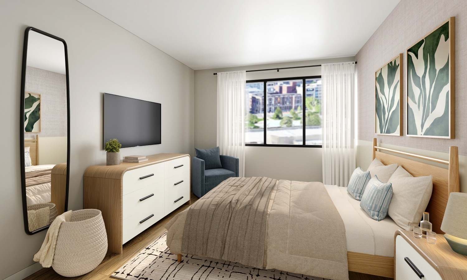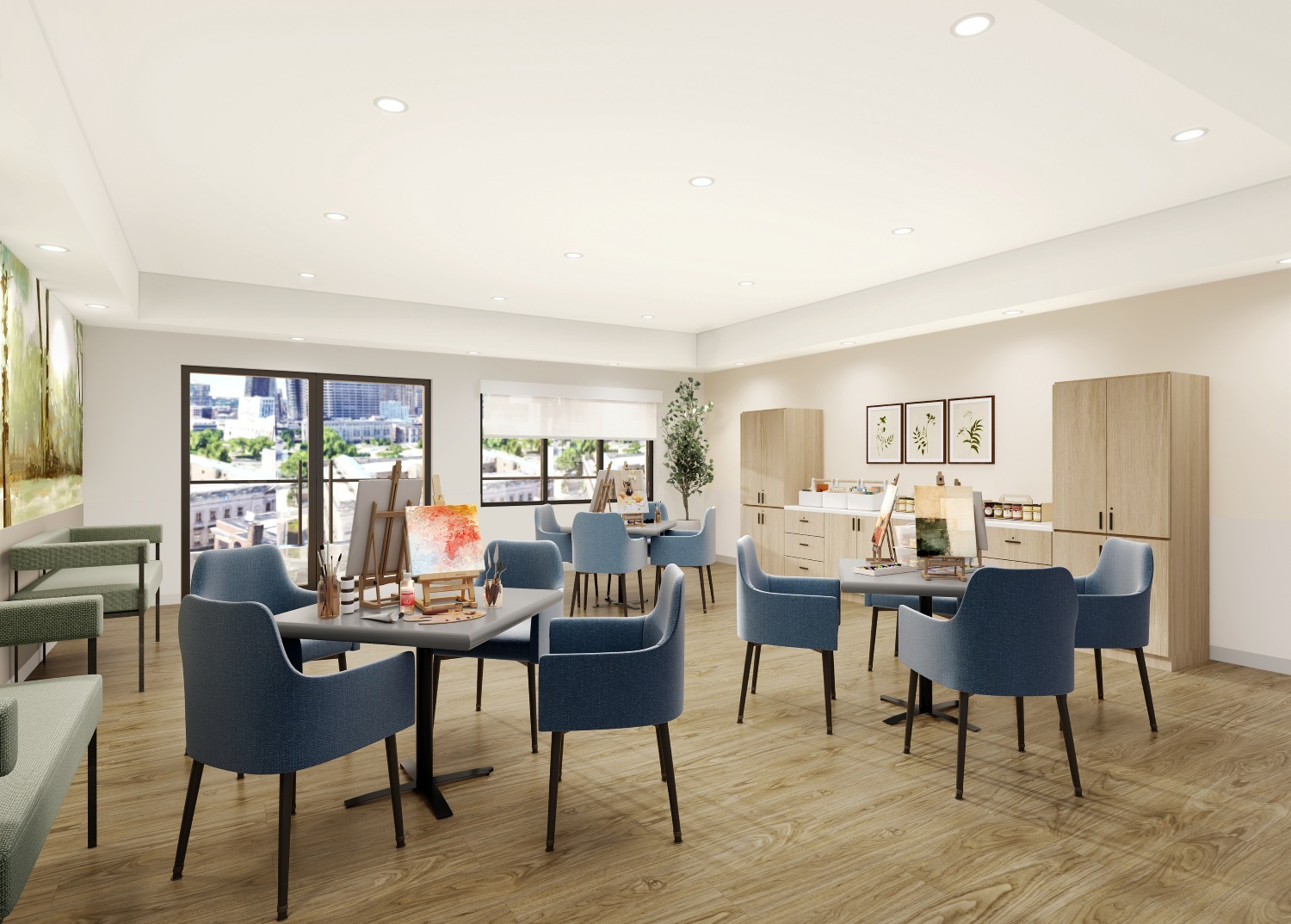 Considerations are made to enhance wayfinding, create purposeful spaces, and enhance sensory experiences, artwork, and color are used to create a calm and comfortable environment.